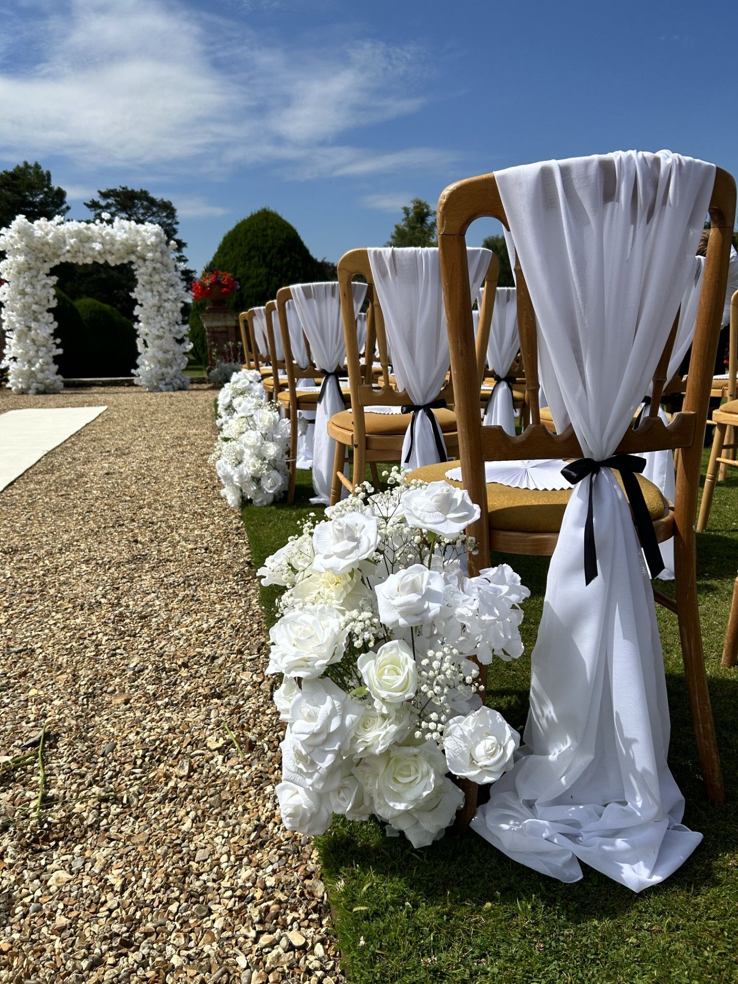 ✔ Aisle décor — flower pieces, floral runners, glassware, pew ends✔ End-of-aisle chair sashes OR bows